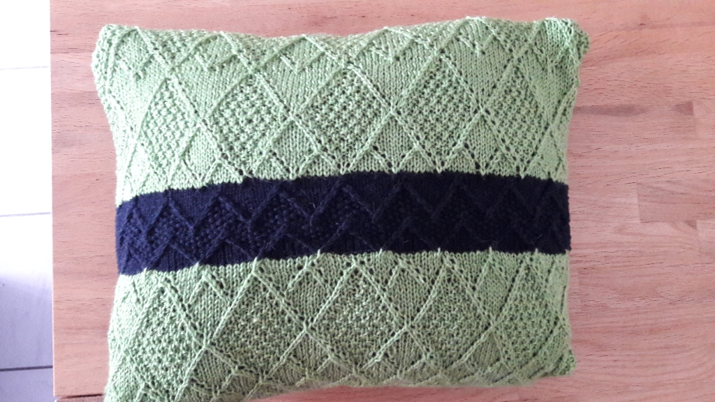 Als nächstes gab es noch zwei Kissen, die auf Vollendung warteten. Das erste sollte eigentlich ein Bezug für ein kleines Regal werden, das farblich so gar nicht passen wollte. Doch das Stricken zog sich hin und in der Zwischenzeit hat sich das Regal so gut eingelebt, dass ein Bezug überflüssig wurde...